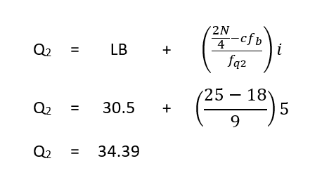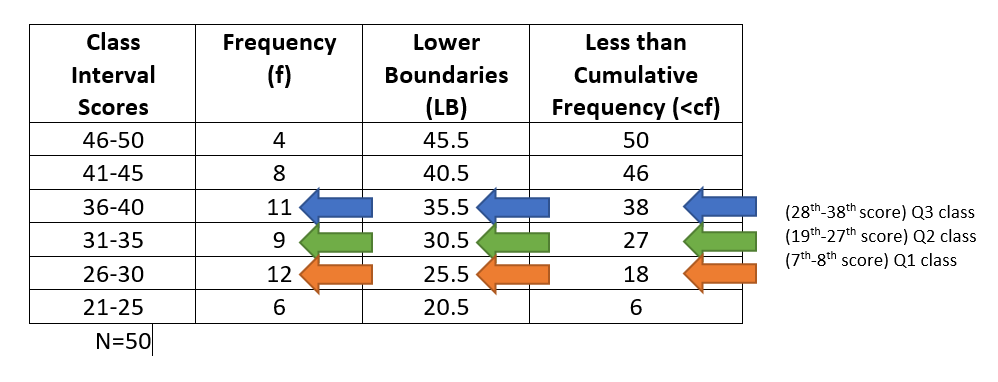 The steps in computing the median are similar ro that of Q1 and Q3. In finding the median, we first need to determine the median class. In the same manner, the Q1 and the Q3 class must be determined first before computing for the value of Q1 and Q3. The Q1 class is the class interval where the (N/4)th score is contained, while the class interval that contains the (3/V/4)th score is the Q3 class.