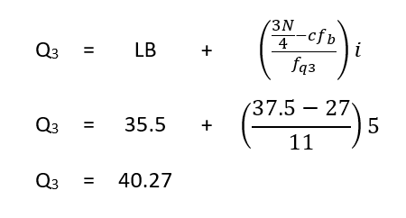 Therefore, the 75% of the students have a score less than or equal to 40.27. The third quartile 40.27 falls within the class boundaries 36-40 which is 35.5-40-5.