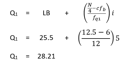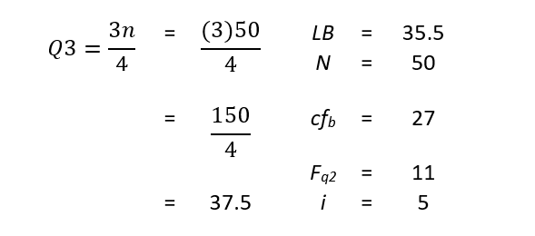 The steps in computing the median are similar ro that of Q1 and Q3. In finding the median, we first need to determine the median class. In the same manner, the Q1 and the Q3 class must be determined first before computing for the value of Q1 and Q3. The Q1 class is the class interval where the (N/4)th score is contained, while the class interval that contains the (3/V/4)th score is the Q3 class.