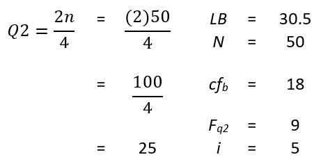 Note that the 19th-27th socres belong to the class interval: 31-35. So, the 25th score is alos within the same class.